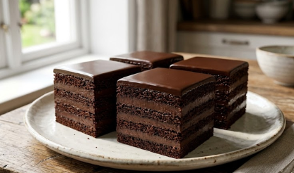 Na slici vidimo predivan, krupni kadar ovog luksuznog deserta serviranog na rustičnom, pegavom keramičkom tanjiru. Četiri precizno isečena, besprekorna kvadratna komada kolača dominiraju scenom. U preseku se savršeno vidi pet tankih, tamnih kakao kora koje su naizmenično premazane debelim slojevima bogatog, tamnog čokoladnog fila. Vrh svakog komada preliven je gustom, sjajnom čokoladnom glazurom koja reflektuje svetlost. Tanjir je smešten na masivnom drvenom stolu, pored starinske viljuške, dok meka prirodna dnevna svetlost sa prozora u pozadini stvara idiličnu, toplu domaćinsku atmosferu.
