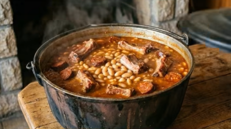 Na slici vidimo predivan, krupni kadar ovog tradicionalnog specijaliteta serviranog u autentičnom, starinskom tamnom metalnom loncu (kazančiću). Pasulj je skuvan do savršenstva – gust, bogat i sjajan, sa vidljivim zrnima belog pasulja koja su zadržala svoj oblik. U loncu dominiraju krupni komadi sočnih suvih rebara i kolutići pržene kobasice koji jelu daju raskošnu teksturu. Iz lonca se blago izvija para, nagoveštavajući svežinu i toplotu jela. Lonac je smešten na rustičnom drvenom stolu ispred zidanog kamina, što stvara neverovatno toplu, etno atmosferu starinskog doma.
