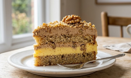 Fotografija kremaste slojevite torte u formatu 16:9. Krupni kadar izbliza. Na belom keramičkom tanjiru serviran je jedan visoki komad torte. Presek jasno prikazuje slojeve: baza od keksa, debeli sloj žutog vanila krema, ponovo sloj keksa, i na vrhu debeli sloj svetlo-smeđeg krema sa orasima. Vrh torte je obilno posut mlevenim orasima i ukrašen jednom celom polovinom oraha. Tanjir se nalazi na rustičnom drvenom stolu pored srebrne viljuške. Scena je obasjana blagom, prirodnom dnevnom svetlošću sa prozora u pozadini, uz zamućene detalje šoljice i stolice. Na slici ne sme biti apsolutno nikakvog teksta, slova ili natpisa.