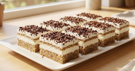 Na slici vidimo predivan, krupni kadar ovog deserta serviranog na dugačkom, belom pravougaonom keramičkom tanjiru. Deset savršeno isečenih pravougaonih komada kolača poređano je u dva niza. Svaki komad jasno prikazuje dva prelepa sloja: donji sloj je tamniji i zrnast, napravljen od mešavine keksa i oraha, dok je gornji sloj izuzetno debeo, snežno beo i kremast. Cela površina kolača je bogato prekrivena tamnim čokoladnim mrvicama (strugotinama). Tanjir je smešten na svetloj drvenoj radnoj ploči pored prozora, a meka, prirodna dnevna svetlost naglašava svaku teksturu i stvara toplu, domaćinsku atmosferu.