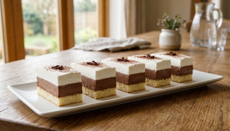 Fotografija kremastog slojevitog kolača u formatu 16:9. Krupni kadar izbliza. Na dugačkom, pravougaonom belom keramičkom tanjiru servirano je pet precizno isečenih komada kolača poređanih u nizu. Presek jasno prikazuje svetli žuti biskvit na dnu, debeli sloj smeđeg čokoladnog krema u sredini i debeli sloj belog šlaga na vrhu. Vrh svakog komada je ukrašen sa malo kakao praha i sitnim čokoladnim kovrdžama. Tanjir se nalazi na rustičnom drvenom stolu. Scena je obasjana blagom, toplom prirodnom dnevnom svetlošću, sa blago zamućenom pozadinom u kojoj se vide prozor, saksija sa biljkom i stakleni bokal. Na slici ne sme biti apsolutno nikakvog teksta, slova ili natpisa.