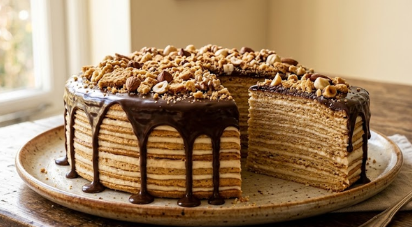 Fotografija visoke slojevite torte u formatu 16:9. Krupni kadar izbliza. Na rustičnom keramičkom tanjiru servirana je velika torta iz koje je izvađen jedan komad. Presek jasno prikazuje mnogo tankih svetlih kora naizmenično premazanih svetlim kremom. Torta nema kremu sa spoljne strane (naked cake stil). Vrh torte je preliven tamnom čokoladom koja curi niz ivice (drip efekat). Odozgo je bogato ukrašena izmrvljenim komadićima keksa, celim lešnicima i orasima. Tanjir se nalazi na drvenom stolu uz starinsku viljušku. Scena je obasjana blagom, prirodnom dnevnom svetlošću sa prozora u pozadini. Na slici ne sme biti apsolutno nikakvog teksta, slova ili natpisa.