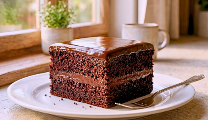 Na slici vidimo predivan, krupni kadar ovog luksuznog deserta serviranog na klasičnom belom keramičkom tanjiru. Jedan savršeno isečen, visoki kvadratni komad kolača dominira scenom, otkrivajući svoj impresivan presek: dva debela sloja tamnog, vlažnog biskvita spojena su raskošnim slojem čokoladnog krema u sredini. Gornja površina kolača je prelivena gustom, sjajnom čokoladnom glazurom koja se blago i zavodljivo sliva niz ivice. Pored kolača, na tanjiru elegantno leži srebrna viljuška. Tanjir je smešten na svetloj mermernoj radnoj površini uz prozor, a meka, prirodna dnevna svetlost naglašava duboku boju čokolade uz blago zamućene zelene biljke u pozadini.