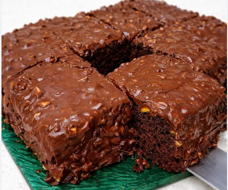 Na slici vidimo predivan, krupni kadar ovog raskošnog deserta serviranog na elegantnoj, tamno zelenoj ploči od škriljca sa izraženom teksturom. Kolač je precizno isečen na primamljive kvadratne komade. Jedan komad se upravo podiže metalnom poslastičarskom lopaticom, otkrivajući svoj tamni, neverovatno vlažan i porozan presek. Cela gornja površina kolača, kao i ivice isečenih komada, bogato su oblivene gustom, sjajnom čokoladnom glazurom u kojoj se jasno vide krupni komadići seckanih lešnika. Ploča je smeštena na svetloj, mermernoj radnoj površini, dok se u blago zamućenoj pozadini nazire topao enterijer kuhinje sa prozorom i keramičkom šoljom, stvarajući savršenu jesenju ili zimsku atmosferu.