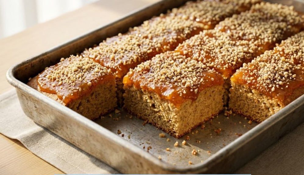 6. Premazivanje i posipanje (Ključni korak): Čim izvadite vreo kolač iz rerne, odmah ga bogato premažite sa 4 pune kašike džema od kajsija. Toplota će blago otopiti džem, omogućavajući mu da savršeno prione uz biskvit. Preko vrućeg džema odmah ravnomerno pospite 150g mlevenih oraha. Ostavite kolač da se ohladi, isecite ga na kocke i poslužite!