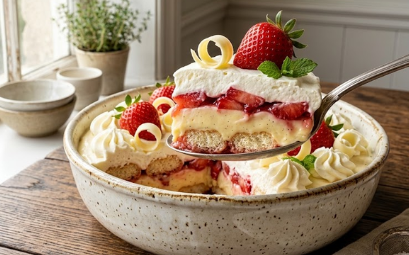 Na slici vidimo predivan, ekstremni makro krupni kadar ovog raskošnog slojevitog deserta serviranog u elegantnoj, svetloj keramičkoj posudi. Veliki, bogat komad torte se podiže metalnom poslastičarskom lopaticom, otkrivajući savršen presek. Jasno se vide donji sloj od keksa, debeli sloj glatkog žutog krema od vanile, jarko crveni sloj sočnih, svežih jagoda i raskošni, snežno beli krem na vrhu. Torta je majstorski dekorisana krupnim, celim jagodama, elegantnim kovrdžama od bele čokolade i svežim listićima zelene nane. Posuda se nalazi na rustičnom drvenom stolu. Scena je obasjana mekom, prirodnom dnevnom svetlošću koja dopire sa prozora u pozadini, naglašavajući svežinu i prolećnu atmosferu.